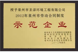 圣元环保泉州市圣泽环境工程有限世界杯官方网站喜获“2012年泉州市劳动合同制度示范企业”荣誉称号