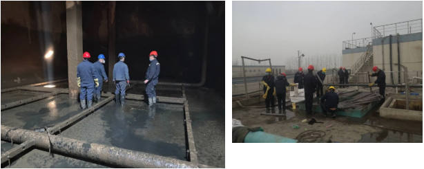 为加快检修进度,渗滤液处理站站长黄兴华、副站长周晨晨实行24小时两班倒,轮流当班,坚守在最前线,哪里最脏臭,哪里最苦累,哪里就有他们。在两位站长的带领下,渗滤液站当班人员、鄄城圣元生产学员夜以继日奋战一线。检修班组各专业严阵以待,及时根据现场需要制作安装排水排泥管道、钢管爬梯、安装夜间照明等,全力以赴、争分夺秒完成此次检修任务。