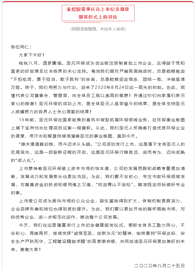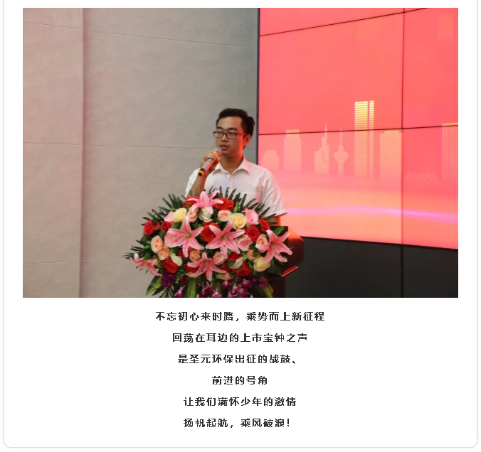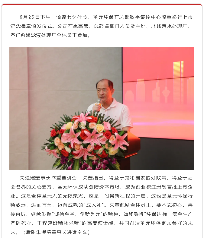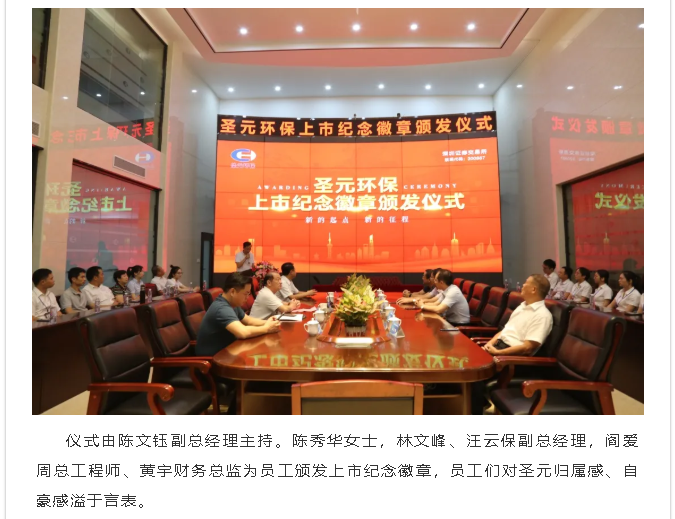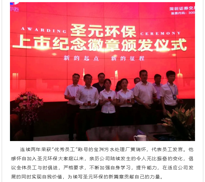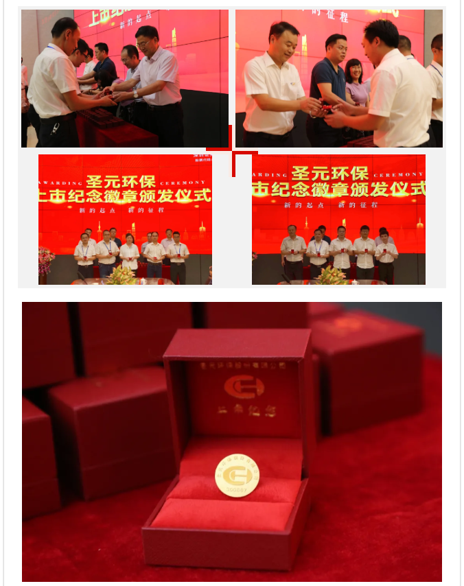挂牌次日,圣元环保给员工颁发上市纪念徽章