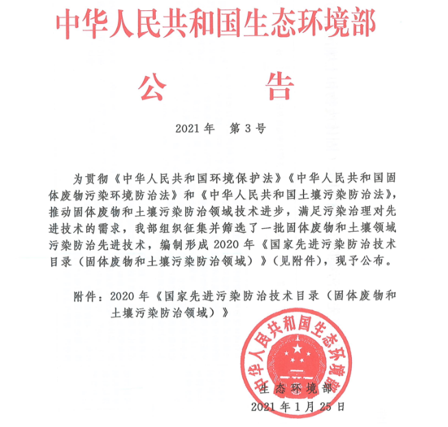 日前,生态环境部发布了2020年《国家先进污染防治技术目录(固体废物和土壤污染防治领域)》(生态环境部公告2021年第3号)(以下简称“目录”)。莆田圣元环保“炉排式生活垃圾焚烧炉协同应急处置医疗废物”技术入选该目录。
