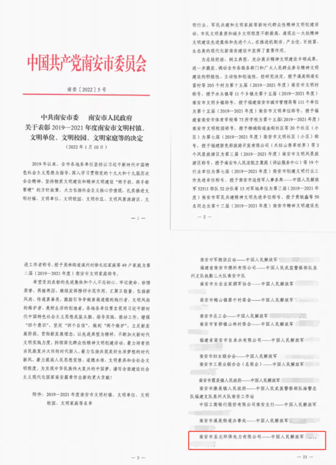 日前,中共南安市市委、南安市人民政府发布《关于表彰2019-2021年度南安市文明村镇、文明单位、文明校园、文明家庭等的决定》,南安圣元榜上有名,获评“军民共建精神文明先进单位”,是全市唯一一家荣获此称号的民营企业单位。