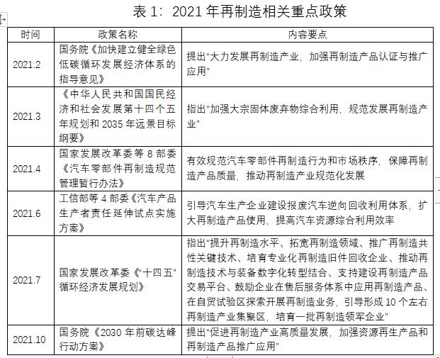 国家政策强力支撑。“十四五”开局之年,助力再制造产业发展的政策密集出台,仅2021年就有6项。具体情况如表1所示: