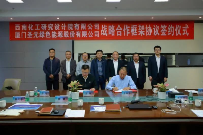 10月12日,圣元环保董事长朱煜煊率队前往西南化工研究院有限世界杯官方网站(以下简称“西南院”)进行座谈交流,双方就圣元绿能氢能源开发项目达成合作意向,并签订战略合作框架协议。西南院副总经理王键,变压吸附所总经理张宏宇、副总工程师冯良兴,工程世界杯官方网站副总工程师周君、营销总监郭庆东,圣元环保技术部总经理王铁军,圣元绿能领导林东廓等出席签约仪式。
