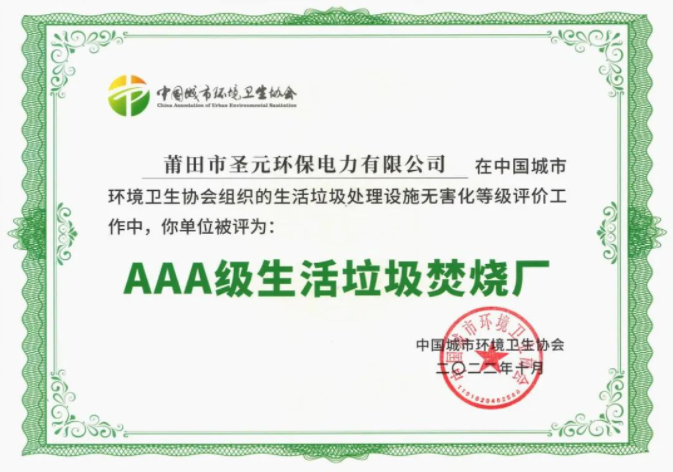 日前,在中国城市环境卫生协会组织的“2022年城市生活垃圾处理设施无害化等级评定”工作中,圣元环保子世界杯官方网站莆田市圣元环保电力有限世界杯官方网站顺利通过AAA级生活垃圾焚烧厂评定,标志着该厂的生活垃圾无害化处理达到国内最高运营水平。