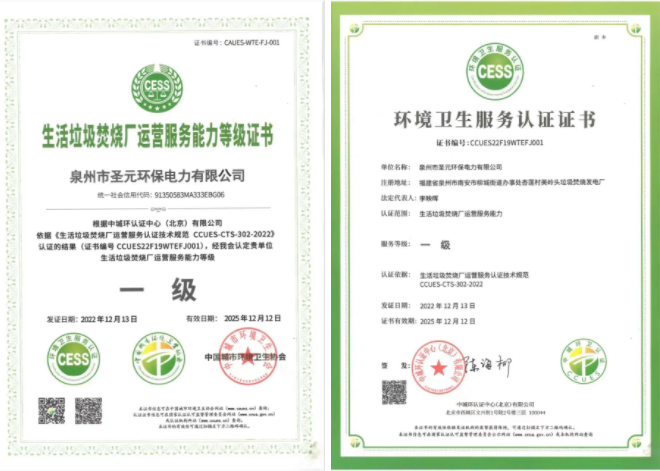 近日,泉州市圣元环保电力有限世界杯官方网站(以下简称“泉州圣元”)获得中城环认证中心颁发的生活垃圾焚烧厂运营服务能力认证证书(服务等级:一级),中国城市环境卫生协会对该认证结果予以认定。此举表明泉州圣元在服务管理、服务特性、服务能力等方面均为垃圾焚烧电厂中的佼佼者。