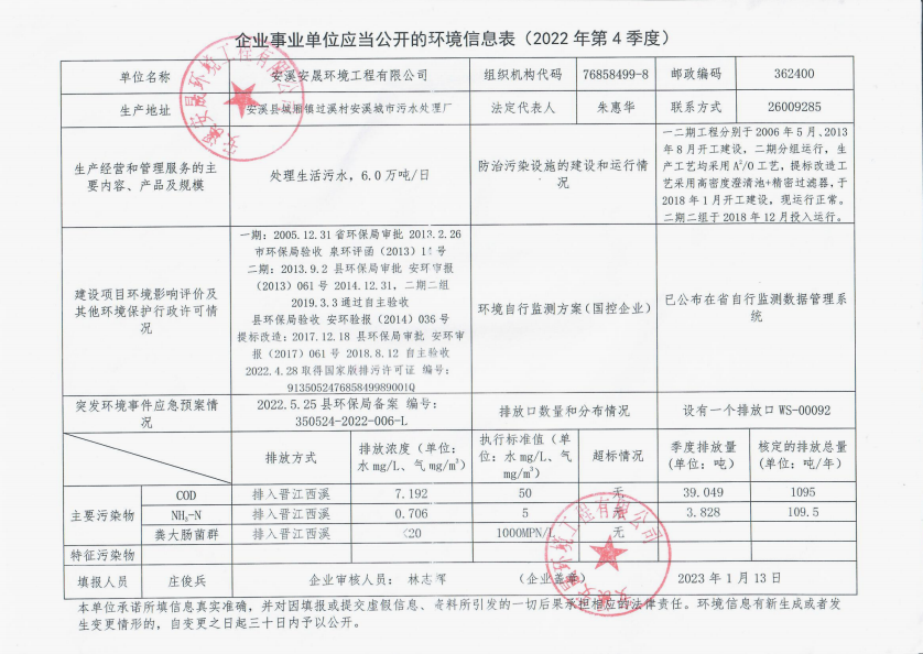 安溪城市污水处理厂2022年第4季度环境信息公开