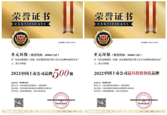 2月25日,由专业品牌评价机构Asiabrand集团发起主办,中国亚洲经济发展协会和亚洲品牌网联合主办的2022品牌强国(龙城)论坛暨第四届中国上市世界杯官方网站品牌500强发布会在山西太原隆重举行。圣元环保继2021年度后再度揽获2022年度“中国上市世界杯官方网站品牌500强”和“中国上市世界杯官方网站最具投资价值品牌”两项荣誉。