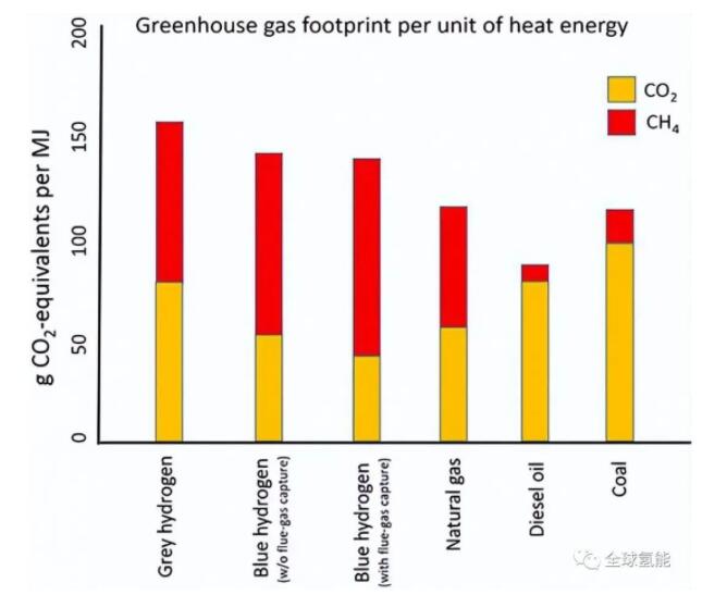 研究发现,蓝氢的主要温室气体包括二氧化碳和未燃烧的甲烷。即使假设捕获的二氧化碳可以永久储存,因存在大量逃逸性甲烷释放,蓝氢制取的温室气体排放量仍然很高。