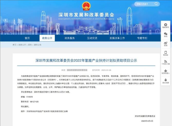 4月6日,广东省深圳市发展和改革委员会发布了《2022年氢能产业扶持计划拟资助项目公示》,深圳三环电子有限世界杯官方网站、哈尔滨工业大学(深圳)、中广核研究院有限世界杯官方网站、氢辉能源(深圳)有限世界杯官方网站等项目入选,最高补助资金达到1000万元。
