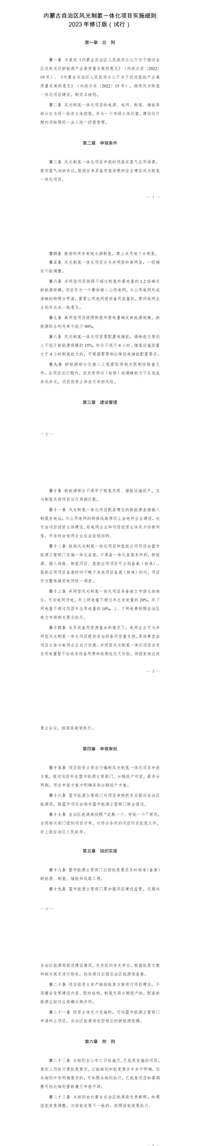 近日,内蒙古自治区能源局发布《内蒙古自治区风光制氢一体化项目实施细则2023年修订版(试行)》等六个市场化实施细则的通知。其中指出:鼓励利用非常规水源制氢,禁止采用地下水制氢。风光制氢一体化项目分为并网型和离网型,一经确定不能调整。并网型项目按照不超过制氢所需电量的1.2倍确定新能源规模。并网型项目按照不超过制氢所需电量的1.2倍确定新能源规模。风光制氢一体化项目需配置电储能,调峰能力原则上不低于新能源规模的15%,时长不低于4小时。储氢设施容量大于4小时制氢能力的,可根据需要相应降低电储能配置要求。