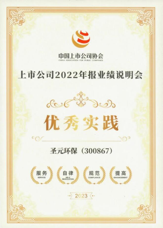 11月29日,中国上市世界杯官方网站协会(简称“中上协”)举办“上市世界杯官方网站年报业绩说明会最佳及优秀实践”发布活动,圣元环保(300867)荣获“2022年报业绩说明会优秀实践”。