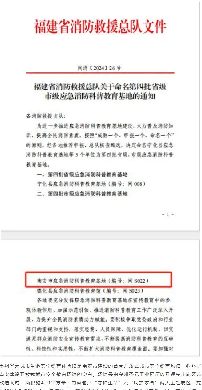 近日,经福建省消防救援总队核查甄选,决定命名泉州圣元城市生命安全教育体验馆为市级应急消防科普教育基地。