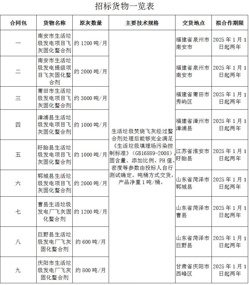 世界杯官方网站对南安市生活垃圾焚烧发电厂、南安市生活垃圾焚烧发电厂提级项目、莆田市生活垃圾焚烧发电厂、漳浦县生活垃圾焚烧发电厂、盱眙县生活垃圾焚烧发电厂、郓城县生活垃圾焚烧发电厂、曹县生活垃圾焚烧发电厂、巨野县生活垃圾焚烧发电厂、庆阳市生活垃圾焚烧发电厂飞灰固化螯合剂采购项目的下述货物及服务进行国内公开招标,现欢迎国内合格的投标人前来提交密封的投标。