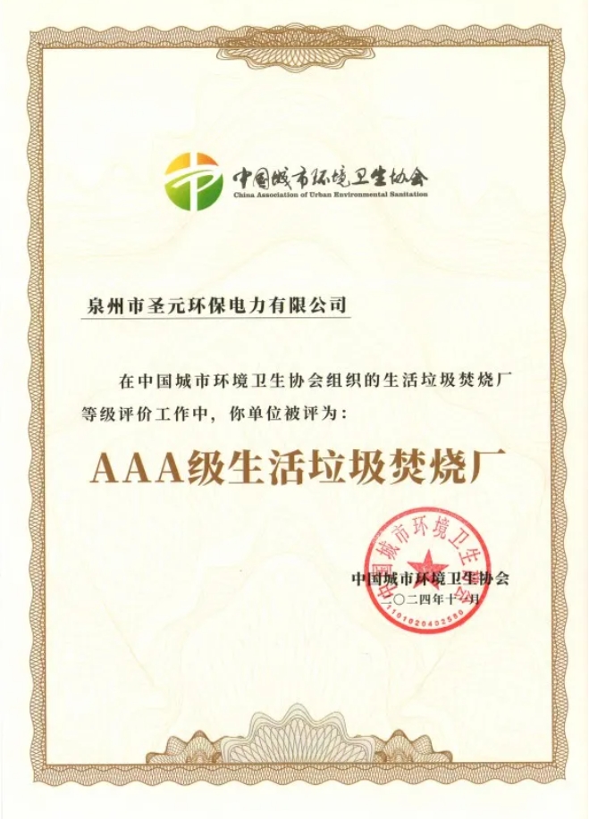 日前,泉州市圣元环保电力有限世界杯官方网站顺利通过中国城市环境卫生协会组织的生活垃圾焚烧厂无害化等级评定,获评国家AAA级生活垃圾焚烧厂。AAA级代表全国生活垃圾处理设施无害化最高等级,标志着泉州圣元生活垃圾无害化处理已达到国内领先水平。