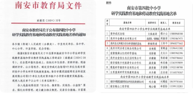 近日,南安市教育局印发《关于公布南安市第四批中小学研学教育基地和劳动教育实践基地名单的通知》,泉州圣元环境与安全科普教育基地入选第四批中小学生研学实践教育基地名单。
