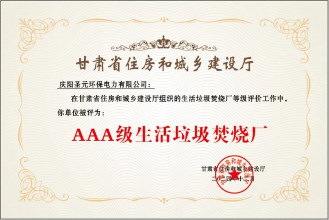 近日,庆阳圣元顺利通过甘肃省住房和城乡建设厅组织的全省生活垃圾焚烧厂等级评价,获评甘肃省AAA级生活垃圾焚烧厂。