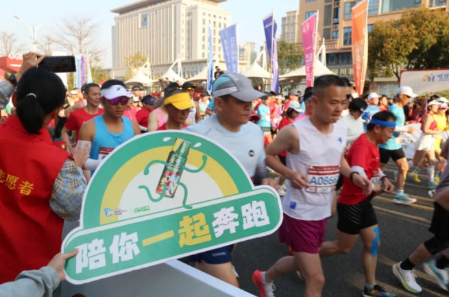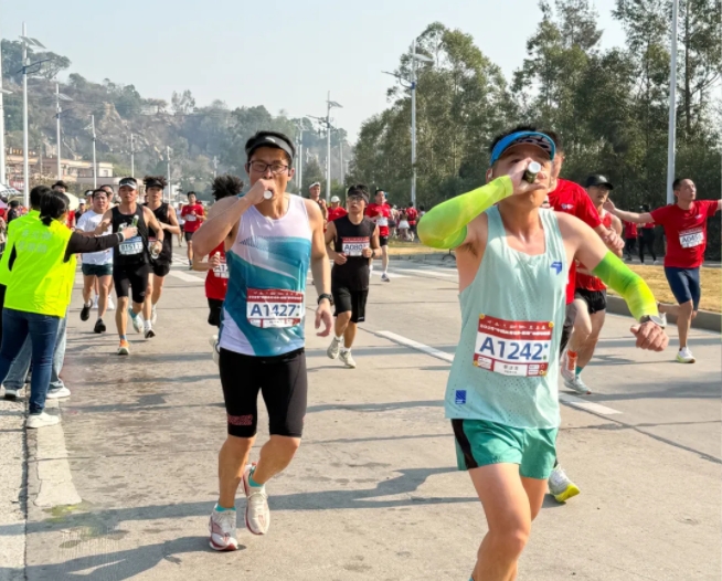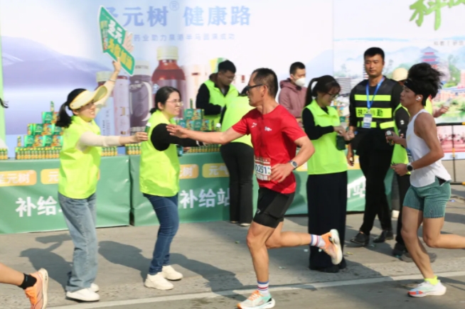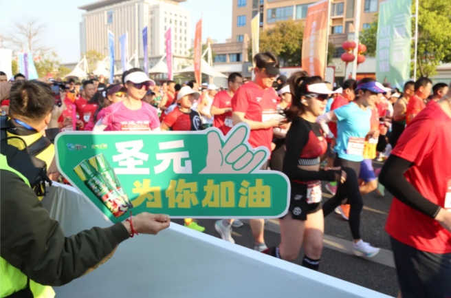 “加油,加油!”元气小树能量补给站边,来自圣元的加油团毫不吝啬赞美、鼓励,为来自各地的跑友送上最热情的助力,并为参赛者分发补给品——60mL便携装元气小树牛磺酸能量饮,富含牛磺酸、维生素B族等成分,护航参赛者保持良好状态、圆满完赛。