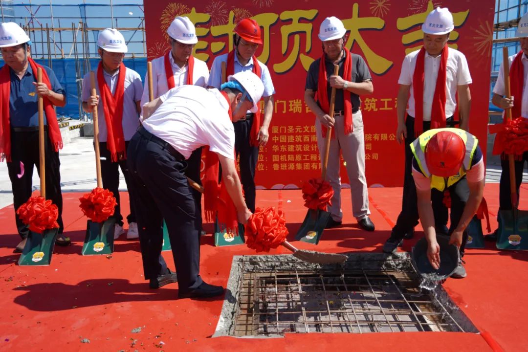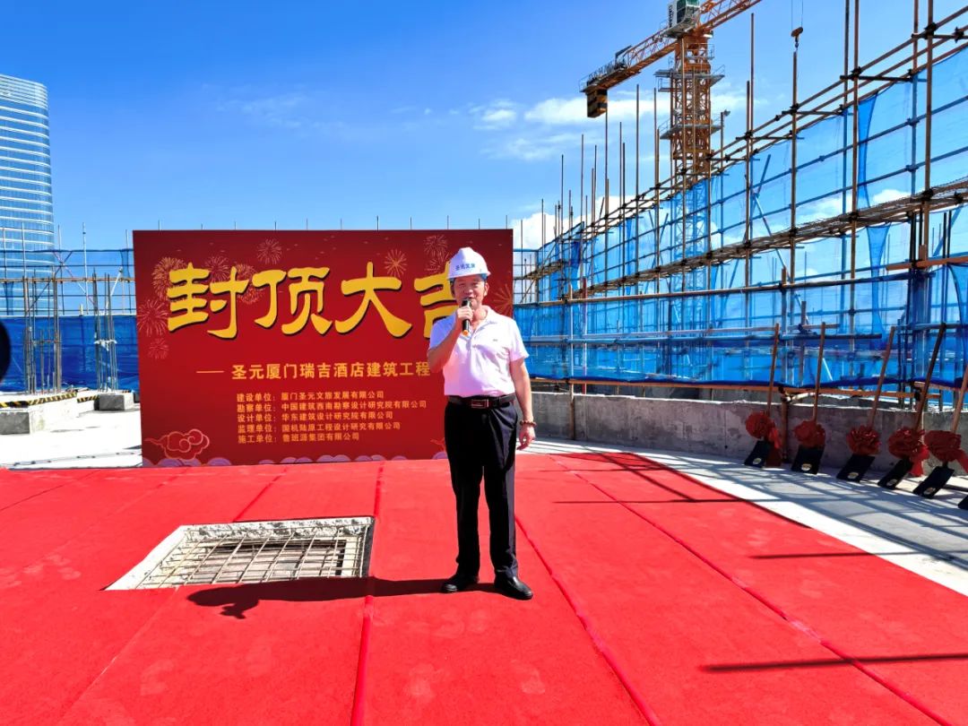 封顶仪式在酒店T2塔楼屋面隆重举行。圣元环保董事长朱煜煊、鲁班源集团董事长白春杨、国际陆原总监刘元周、项目设计方澳洲AW设计世界杯官方网站合伙人杨朝闵、幕墙顾问厦门锐建总经理赵志刚、圣元厦门瑞吉酒店项目总指挥朱鑫强等嘉宾及参建单位相关人员共同出席。