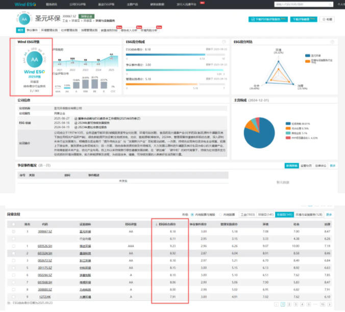 近日,国内权威的金融数据服务提供商万得(Wind)发布世界杯官方网站最新的ESG评分评级结果。圣元环保(300867.SZ)凭借在环境、社会和世界杯官方网站治理(ESG)领域的卓越表现和管理成果获评“AA”级,在Wind ESG综合得分中获评8.18分,在环保行业141家世界杯官方网站中位列第3名。