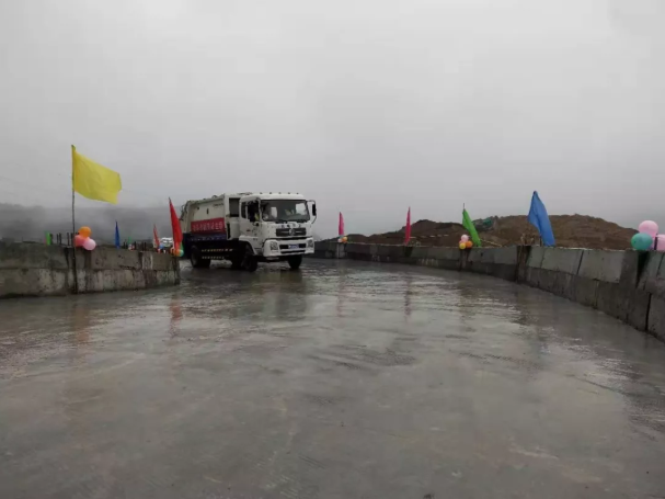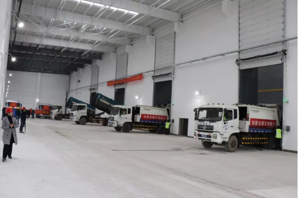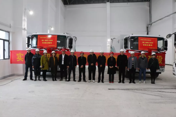 10点30分,厂区另一边,四辆垃圾运输车依次驶上栈桥。在垃圾接收大厅,葛鹏程局长代表环卫部门宣布垃圾进场,四辆垃圾运输车同时启动,将垃圾倾倒进垃圾储坑。随后,葛鹏程局长一行代表市容环境卫生管理局接收圣元环保提供的垃圾压缩车,并在接收大厅与庆阳项目工作人员合影留念。